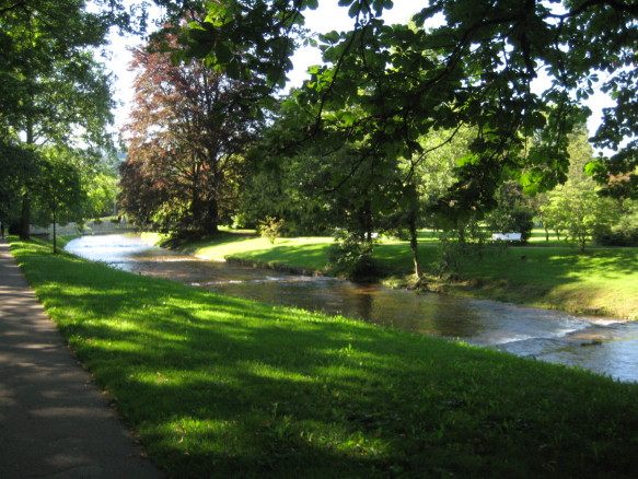Theres refreshment along the way! If youre feeling peckish, why not stop by the Café Bellevue just across the river, for a Greek Salad and a beer. Carry on along the park and youre in the city almost without knowing it, for park merges imperceptibly into city-scape, with paved squares and fountains, then the usual spa and casino facilities and perhaps an afternoon concert! |